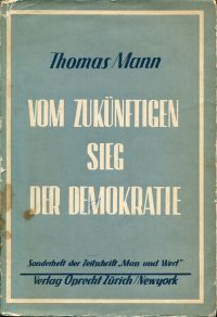 Mann, Thomas: Vom zukünftigen Sieg der Demokratie. 3. Auflage. Zürich: Oprecht 1938. Gr.-8°. 45 S., broschiert (Papier leicht gebräunt; Einband befleckt und abgegriffen; Randläsuren; wenig Anstreichungen) (=Maß und Wort; 1938, Sonderheft)