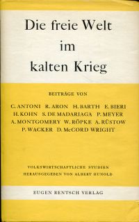 Antoni, Carlo: Die freie Welt im Kalten Krieg. Erlenbach-Zürich: Rentsch 1955. 8°. 276 S., Leinen (SU wenig bestossen; sonst gut erhalten) (=Volkswirtschaftliche Studien für das Schweizerische Institut für Auslandforschung) Vorliegend Ex. Nr. 185 von 300 unverkäuflichen Exemplaren. Aufsätze von C. Antoni, R. Aron, H. Barth, E. Bieri, H. Kohn, S. de Madariaga, P. Meyer, A. Montgomery, W. Röpke, A. Rüstow, P. Wacker, D. McCord Wright.