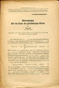 Iff, Paul: Untersuchungen über das Gesetz des gleichmässigen Alterns. Bern 1926. 8°. S. 44-53, geheftet (gebräunt; leichte Randläsuren) (=Sonderdruck aus: Jahrbuch der Philosophischen Fakultät II der Universität Bern, Band VII; Inauguraldissertationen (Auszüge) zur Erlangung der Doktorwürde [Versicherungslehre])