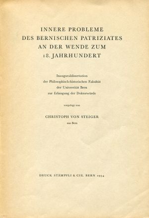 Steiger, Christoph: Innere Probleme des bernischen Patriziates an der Wende zum 18. Jahrhundert. Bern: Stämpfli 1954. 8°. X, 132 S., broschiert (Stempel auf Schmutztitel; Kapital oben mit kleiner Fehlstelle; wemig Bleistiftanstreichungen; angebräunt) (=Dissertation Bern 1954)