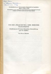 Strahm, Hans: Um die „Fälschung“ der Berner Handfeste. Erwiderung auf Hermann Rennefahrts Beweisführung gegen die Echtheit. Zürich 1954. 8°. S. 478-509, broschiert (private Widmung des Autors auf Vorsatz; sonst gut erhalten) (=Separatabdruck aus: Schweizerische Zeitschrift für Geschichte, Band 4, Heft 4, 1954)