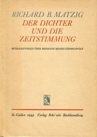 Matzig, Richard Blasius: Der Dichter und die Zeitstimmung. Betrachtungen über Hermann Hesses Steppenwolf. St. Gallen: Fehr 1944. 8°. 51 S., engl. broschiert (Umschlag angebräunt; gut erhalten) (=Veröffentlichungen der Handels-Hochschule St. Gallen : Reihe B H. 8)
