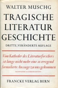 Muschg, Walter: Tragische Literaturgeschichte. 3. veränderte Auflage. Bern: Fancke 1957. Gr.-8°. 639 S., Leinen (private Widmung auf Vorsatz; Schutzumschlag teilweise angebräunt, wenig befleckt und mit leichten Randläsuren; sonst gut erhalten)