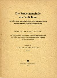 Haag, Robert Eduard: Die Burgergemeinde der Stadt Bern im Lichte ihrer wirtschaftlichen, sozialpolitischen und wissenschaftlich-kulturellen Bedeutung. Zürich: Juris 1968. 8°. 162 S., broschiert (Kopfschnitt leicht stockfleckig; gut erhalten)