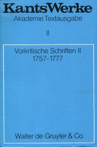 Kant, Immanuel: Vorkritische Schriften II. 1757 – 1777. Berlin: de Gruyter 1968. 8°. VIII, 452 S.. broschiert (Buchblock mit einem Schnittfehler ohne Textverlust; sonst gut erhalten) (=Kants Werke, : Akademie-Textausgabe ; 2) Text in Fraktur.