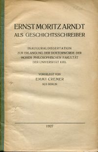 Cremer, Emmy: Ernst Moritz Arndt als Geschichtsschreiber. [Potsdam: Stiftungsverlag] 1927. 8°. 95 S., broschiert (Umschlag angestaubt und abgegriffen; Papierbedingt leicht gebräunt) (=Dissertation Kiel 1927)