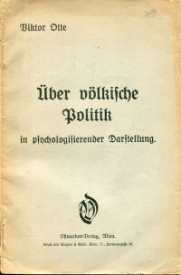 Otte, Viktor: Über völkische Politik in psychologisierender Darstellung. Beiträge zur Psychologie politischer Werturteile. Wien: Ostmarken-Verlag 1923. Gr.-8°. 118 S., broschiert Einband mit leichten Gebrauchsspuren; Rücken mit Fehlstellen ohne Textverlust; Papier altersbedingt leicht gebräunt) Text in Fraktur.