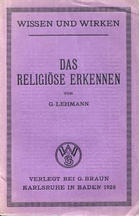 Lehmann, Gerhard: Das religiöse Erkennen. Untersuchung über Bedeutung und Grenzen der religiösen Begriffsbildung. Karlsruhe: Braun 1926. 8°. 89 S., broschiert (Einband teilweise abgeblasst; altersgemäss gut erhalten) (=Wissen und Wirken, 37)