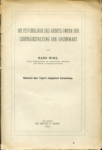 Wirz, Hans: Die Psychologie des Gebets unter der Lebensgestaltung der Gegenwart. Bekroond door Teyler’s Godgeleerd Genootschap. Haarlem: Bohn 1914. 8°. 146 S., broschiert (Besitzervermerk auf Vorsatz; Umschlag von Buchblock losgelöst, befleckt, eingerissen und angestaubt; Papier altersbedingt leicht gebräunt; leicht abgegriffen)