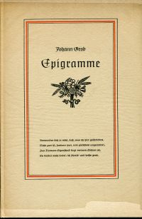 Grob, Johann: Epigramme. Bern: Francke 1939. 8°. 64 S., Pappband (leicht angebräunt; altersgemäss gut erhalten)