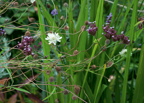 bildreich karten PK 1139: sommerabendtraum III. Querformat. (Garten, Skabiose, Geflecht, Gräser) Mindestbestellmenge: 15 Karten (auch assortiert).