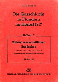 Volkart, Walter: Die Gasschlacht in Flandern im Herbst 1917. Eine Studie über den Einsatz einer Großwaffe und ihre Auswirkungen auf den Kriegsverlauf. Berlin: Mittler 1957. 8°. 82 S., Illustrationen, broschiert (Papierbedingt gebräunt; sonst gut erhalten) (=Wehrwissenschaftliche Rundschau; Beiheft, 7)