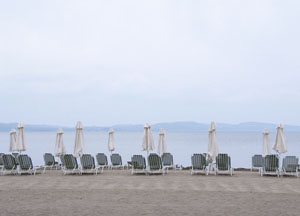 bildreich karten PK 499: spätsaison. Querformat. (Strand, Liegestühle, Sonnenschirme, Sand, Nebel) Mindestbestellmenge: 15 Karten (auch assortiert).