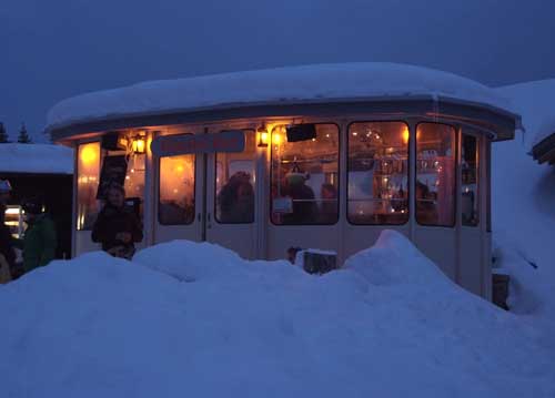 bildreich karten PK 761: gondelbar. Querformat. (Licht, Alp, Gondel, Bar, Mürren, Schnee, Après Ski, Abend, Abendlicht, Zwielicht)