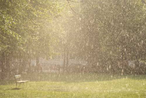 bildreich karten PK 802: fruehlingsregen II. Querformat. (Regen, Bank, Sitzbank, Wiese, Park, Bäume, Baum, Sonne) Mindestbestellmenge: 15 Karten (auch assortiert).