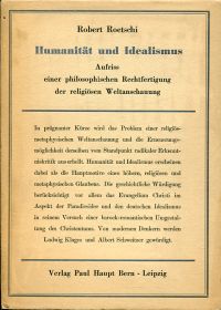 Humanität und Idealismus. Aufriss einer philosophischen Rechtfertigung der religiösen Weltanschauung. Bern: Haupt 1943. 8°. 164 S., Leinen (private Widmung des Autors auf Vorsatz; Schutzumschlag mit leichten Randläsuren und angestaubt; Einband teilweise abgeblasst; sonst altersgemäss gut erhalten)