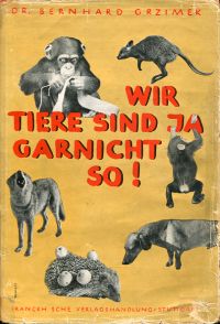 Grzimek, Bernhard: Wir Tiere sind ja gar nicht so! Plaudereien, Beobachtungen und Versuche aus dem Tierreich. 1. – 10. Tsd. Stuttgart: Kosmos 1941. Gr.-8°. 141 S., 182 sw-Abbildungen, Halbleinen (Stempel auf Vorsatz; Schutzumschlag lädiert; Papier altersbedingt gebräunt; sonst altersgemäss gut erhalten)