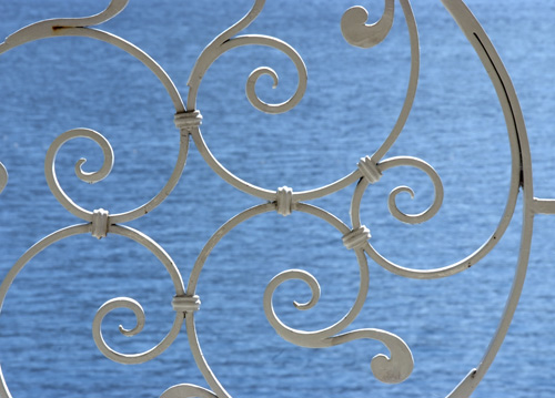 bildreich karten PK 623: sonnentag. Querformat. (See, Meer, Balkon, Geländer, Ornament, Aussicht, Ausblick, Durchblick, Ferien, Urlaub, Süden, Licht, Sonne) Mindestbestellmenge: 15 Karten (auch assortiert).