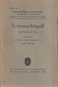 Spee, Friedrich von: Trutznachtigall. Halle/Saale: Niemeyer 1936. 8°. XXIV, 13, 344 S., S. XXXIII – CLXXXI. Broschiert (Besitzervermerk auf Vorsatz; Ex Libris auf Innendeckel; gut erhalten) (=Neudrucke deutscher Litteraturwerke des XVI. und XVII. Jahrhunderts, Nr. 292-301)