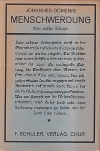 Domenig, Johannes: Menschwerdung. Eine epische Trilogie. Chur, Schuler, 1925. 8°. 239 S. Leinen mit Kopffarbschnitt Schutzumschlag mit leichten Randläsuren und teilweise abgeblasst; sonst altersgemäss gut erhalten)