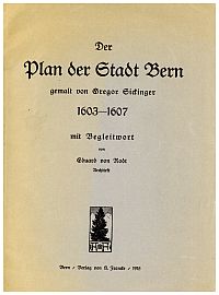 Rodt, Eduard von: Der Plan der Stadt Bern gemalt von Gregor Siekinger. 1603-1607 ; [nur Text]. Bern: A. Francke 1915. Lex.-8°. 16 S. Broschiert Einband mit leichten Gebrauchsspuren; Papier altersbedingt leicht gebräunt; altersgemäss gut erhalten) [=Die Stadt Bern im Jahre 1607 / Gregor Siekinger, Begleitw.] Text in Fraktur.