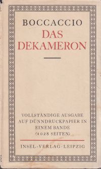 Boccaccio, Giovanni: Das Dekameron. Übertragung von Albert Wesselsky. Nachschöpfung der Gedichte von Theodor Däubler. 36. – 42. Tsd. Leipzig: Insel 1928. Kl.-8°. 1026 S. kartonierte Leinen (Schutzumschlag mit leichten Randläsuren; altersgemäss gut erhalten)