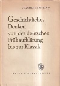 Streisand, Joachim: Geschichtliches Denken von der deutschen Frühaufklärung bis zur Klassik. Berlin: Akademie 1964. 8°. 123 S., Leinen (Schutzumschlag mit leichten Randläsuren und leicht angestaubt; leicht angebräunt; gut erhalten) (=Schriften des Instituts für Geschichte / Deutsche Akademie der Wissenschaften zu Berlin; Reihe 1, Allgemeine und deutsche Geschichte, 22)