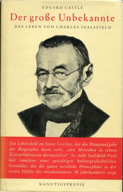 Castle, Eduard: Der grosse Unbekannte. Das Leben von Charles Sealsfield (Karl Postl). Wien/München: Manutiuspresse 1952. 8°. 726 S., 34 Bilder und 1 Stammtafel, Leinen (Schutzumschlag mit leichten Randläsuren; gut erhalten) Der bewegte und spannende Lebenslgeschichte eines mährischen Autors, der über die Schweiz nach Amerika auswandert, und immer wieder nach Europa und die Schweiz zurückkehrte. Ab 1832/33 lebte er an wechselnden Orten in der Schweiz und starb 1864 in Solothurn. Der Nachlass wird in der Zentralbibliothek Solothurn aufbewahrt.