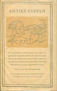 Antike Fabeln. Hesiod, Archilochos, Aesop, Ennius, Horaz, Phaedrus, Babrios, Avianus, Romulus ; mit 97 Bildern des Ulmer Aesop von 1476. Eingeleitet und neu übertragen von Ludwig Mader. Zürich: Artemis 1951. 8°. 368 S., 97 Illustrationen, Leinen mit Kopffarbschnitt (gut erhalten) (=Die Bibliothek der Alten Welt; Griechisch-römische Reihe)