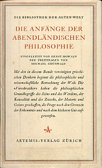 Die Anfänge der abendländischen Philosophie. Fragmente und Lehrberichte der Vorsokratiker. Eingeleitet von Ernst Howald. Neu übteragen von Michael Grünwald. Zürich: Artemis 1949. 8°. XXVIII, 266 S., 4 Bildtafeln, Leinen (Schutzumschlag leicht stockfleckig; gut erhalten) (=Die Bibliothek der Alten Welt : Griechische Reihe)