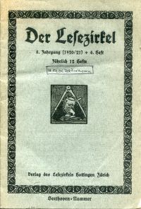 Federer, Heinrich: Beethoven. – Angehängt: Beethoven: Das Heiligenstädter Testament; Jelmoli, Hans: Beethovens Lieder; Faesi, Robert: Hugo von Hofmannsthal. Zürich: Verlag des Lesezirkels Hottingen 1920. Gr.-8°. 18 S. Geheftet (leicht geknickt, etwas gebräunt) (=Der Lesezirkel, Jg. 8, Heft 4 = Dezember 1920/=Beethoven-Nummer). Text in Fraktur.