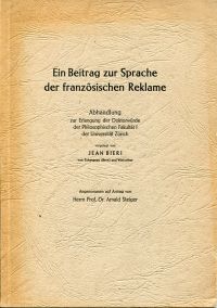 Bieri, Jean: Ein Beitrag zur Sprache der französischen Reklame. Ravensburg: Rappold 1952. Gr.-8°. XVIII, 67 S., broschiert (gebräunt; gut erhalten) (=Dissertation Universität Zürich, Philosophische Fakultät I, 1952).