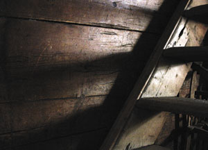 bildreich karten PK 23: winterlicht II. Querformat. 2001. (Holz, Holztreppe, Treppe, Stiege, Licht, Schatten, Walserhaus, Wand) Mindestbestellmenge: 15 Karten (auch assortiert).