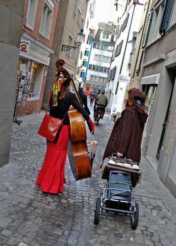bildreich karten PK 1052: rumpel & racine. Hochformat. (Zürich, Altstadt, Strassenmusik, Strassenmusikanten, Bass, Gasse, Froschaugasse, Pflastersteine, Frau, Duo) Mindestbestellmenge: 15 Karten (auch assortiert).