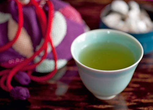 bildreich karten PK 1055: tee im badehaus. Querformat. (Bad, Teetasse, Teeschale, Grüntee, Teehaus, Stoff, Stoffbeutel, Beutel, Tablett, Holztablett, Kirschbaum, Zucker, Grüntee) Mindestbestellmenge: 15 Karten (auch assortiert).