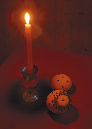 bildreich karten PK 140: winterabend. Hochformat. 2005. (Kerze, Orange, Nelken, Tisch, Tischtuch) Mindestbestellmenge: 15 Karten (auch assortiert).