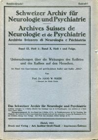 Maier, Hans Wolfgang: Untersuchungen über die Wirkungen des Koffeins und des Kaffees auf den Menschen. Aus dem Laboratorium der psychiatrischen Universitätsklinik in Zürich. An Hand von Experimenten mit gewöhnlichem Kaffee und Kaffee „Hag“. Zürich: Art. Institut Orell Füssli 1921. Gr.-8°. 47 S., 14 Tafeln, broschiert (Einband mit Randläsuren; sonst gut erhalten) (=Aus: Schweizer Archiv für Neurologie und Psychiatrie. Bd. 9, H. 2; Bd. 10, H. 1 u. Folge)