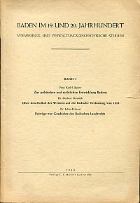Baden im 19. und 20. Jahrhundert. Verfassungs- und Verwaltungsgeschichtliche Studien, Band 1: Bader, Karl S.: Zur politischen und rechtlichen Entwicklung Badens – Heinrich, Herbert: Übder den Einfluss des Westens auf die badische Verfassung von 1818 . Federer, Julius: Beiträge zur Geschichte des Badischen Landrechts. Karlsruhe: Müller 1953. 8°. 181 S., Broschiert (angebräunt; Einband mit Gebrauchsspuren und kleinen Einrissen; sonst gut erhalten)