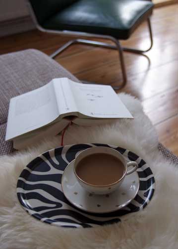 bildreich karten PK 837: an einem stillen nachmittag. Hochformat. (Kaffeetasse, Tablett, Fell, Sessel) Mindestbestellmenge: 15 Karten (auch assortiert).
