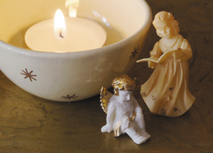 bildreich karten PK 216: lied für einen kleinen engel. Querformat. 2006. (Teelicht, Stern, Porzellan, Figur, Engel, Gesamg, Weihnachtslied, Singen, Musik, Messing) Mindestbestellmenge: 15 Karten (auch assortiert).