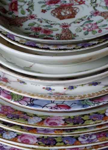 bildreich karten PK 657: bluemchenteller. Hochformat. (Porzellan, Teller, Blumen, Blümchen, Tellerberg, Stapel, Geschirr, Einladung, Kuchenteller, Dessert, Nachspeise) Mindestbestellmenge: 15 Karten (auch assortiert).