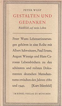 Wust, Peter: Gestalten und Gedanken. Rückblick auf mein Leben. 5. Aufl., 13. – 16. Tsd. München: Kösel 1961. 8°. 261 S. 1 Titelbild, Leinen (Besitzervermerk auf Vorsatz; gut erhalten)