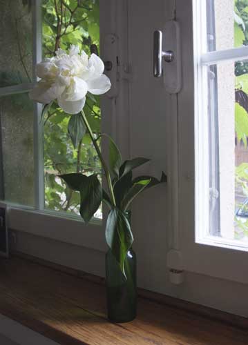 bildreich karten PK 725: bei marianne. Hochformat. (Pfingstrose, Vase, Fenster, Sims, Fensterbrett)
