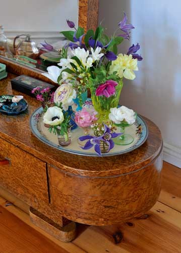 bildreich karten PK 904: stelldichein. Hochformat. (Tablett, Emaille, Vasen, Gläser, Anemone, Nelken, Clematis, Boudoir, Kommode, Spiegel) Mindestbestellmenge: 15 Karten (auch assortiert).
