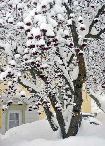 bildreich karten PK 970: eingeschneit. Hochformat. (Vogelbeere, Beeren, Baum, Haus, Fassade, Garten, Schnee) Mindestbestellmenge: 15 Karten (auch assortiert).