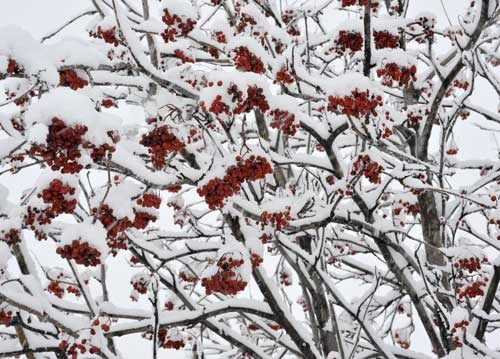 bildreich karten PK 972: morgenueberraschung. Querformat. (Schnee, Vogelbeere, Äste, Zweige, Baum, Last, Beeren) Mindestbestellmenge: 15 Karten (auch assortiert).